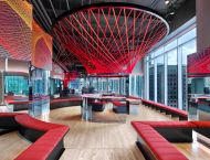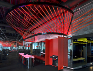 Our design integrates elements of everyday fitness equipment and components into the interior architecture. Three colors of TRX fitness straps, brightly lit, are arranged into a series of grand ceiling sculptures, starting over the front desk and ending at the entry to the locker rooms. The series is visually connected via a 2D graphic painted on the raw concrete core wall. A two-way mirror at the entry provides a reflective surface for the group fitness area while allowing views to the inside by people in adjacent areas, creating a theatrical, high-energy entrance. Finishes and furnishings take their cue from high-performance fitness fabrics and sneaker materials.