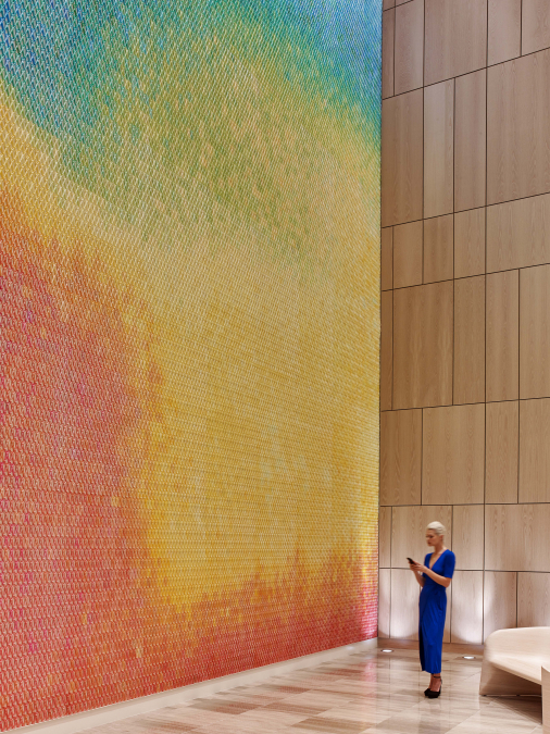 The lower lobby transitions hotel guests from the porte cochere to the sky lobby and features a signature art installation by Korean artist Do Ho Suh. The piece, entitled “Screen”, is composed of 86,000 individually cast resin figures. The multi-colored piece dominates the space spanning the entire height and occupying multiple walls. From here, four double-deck high-speed elevators whisk guests to the unprecedented 70th-floor check-in lobby in under forty seconds. This experience is enhanced by a large digital display screening movie shorts and digital art installations.