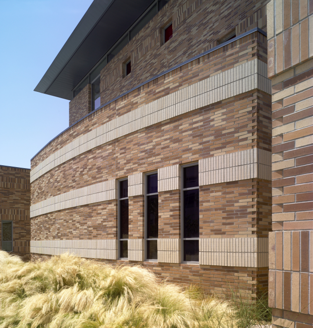 The main sanctuary is voluminous, bathed in filtered light highlighting the altar. The curved walls of the sanctuary were designed to make the experience of being in this space unlike any other place on campus. Above the altar is a golden-bronze metal sculpture portraying the setting moon and the rising sun. Light entering from the skylight and art glass windows interweaves with interior lighting to play upon the sculpture's metallic surface. The exterior is sheathed in golden collegiate brick providing a contextual relationship to the campus buildings and to the historic setting of Old Towne Orange.