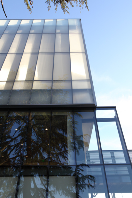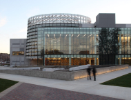 Situated on the central campus adjacent to the Peace Garden, a unique feature of the library is its entirely transparent façade on the north elevation, which allows abundant light into the building while providing a beautiful view of the garden. Extensive use of natural daylight, natural ventilation and the use of recycled products during construction has resulted in a highly sustainable building.