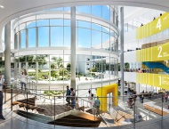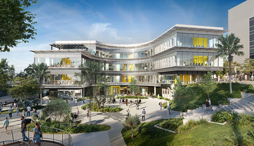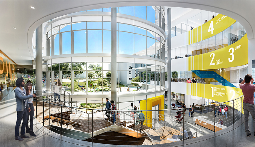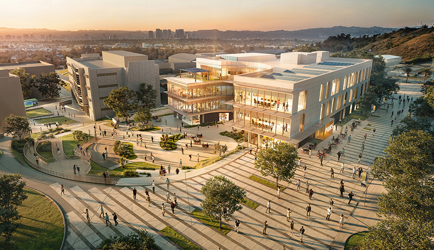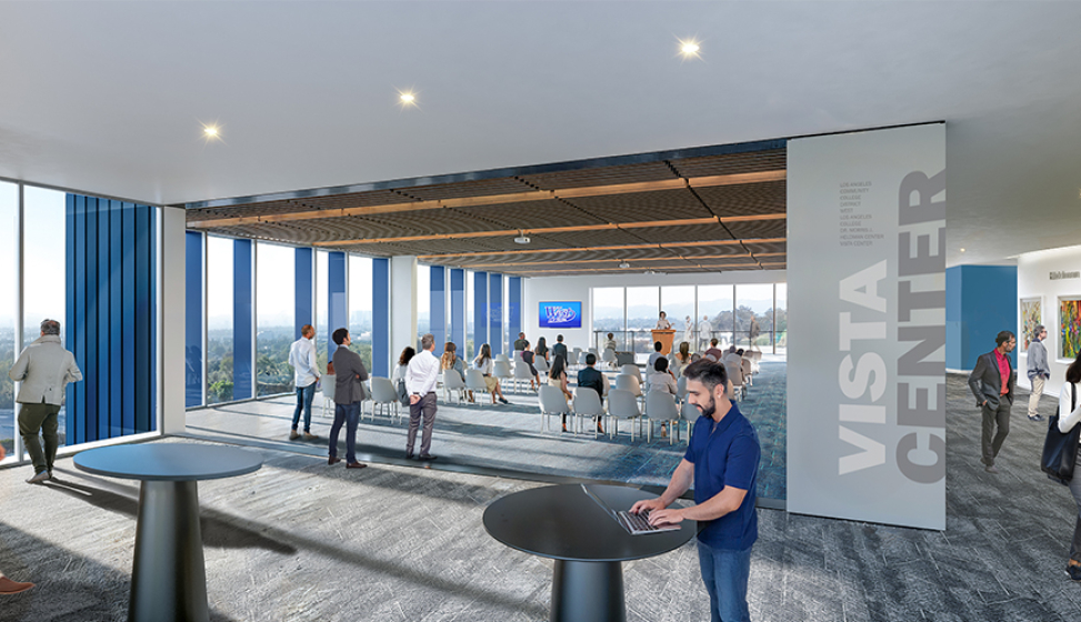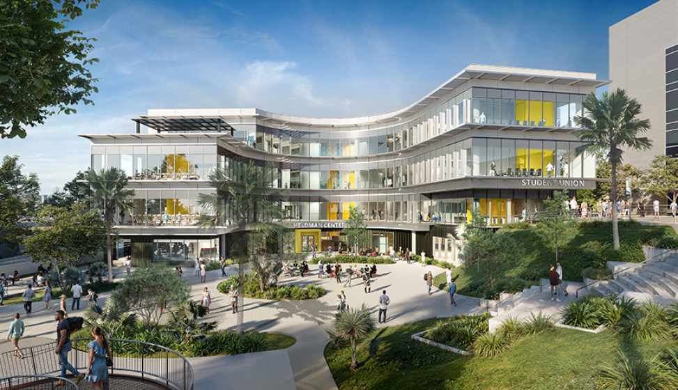 The Heldman Center is envisioned as a space that fosters social interaction and intellectual engagement, offering students a range of environments where they can build community, collaborate on projects, and participate in cultural events. The new 72,867 SF, four-level Heldman Center at West Los Angeles College (WLAC) is designed to integrate with the existing Student Services Center, forming a cohesive pair focused on advancing student success. Serving as an inclusive campus hub, the Heldman Center will centralize essential student services and academic resources, address universal accessibility, and provide spaces for social interaction and academic engagement. The facility will house the campus library, student union, student learning center, administrative offices, and an event center, while connecting Wildcat Walk to the Student Services Center.