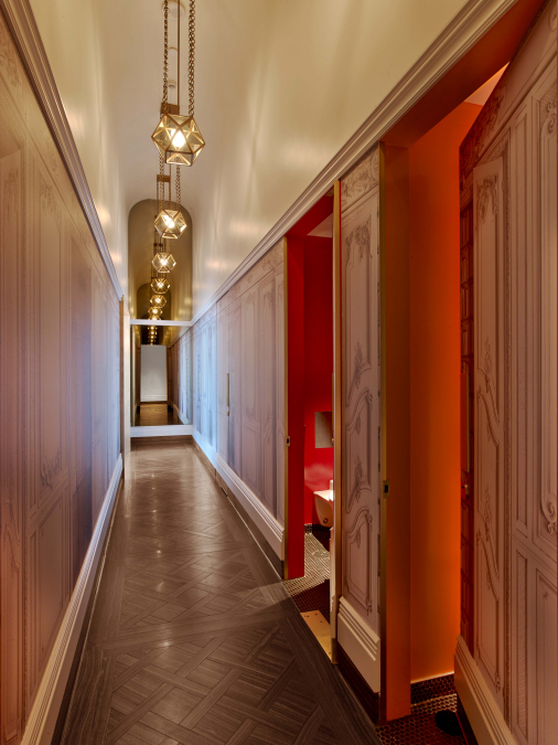 In contrast, the ladies room is a cheeky twist on Versailles elements. Parquet flooring, continuing the pattern from the restaurant is made of dark brown marble. Past the entry vestibule, a long double-height hall is exaggerated with mirrors, reminiscent of the Hall of Mirrors from Versailles. Hidden doors and faux wall paneling mask four individual toilet rooms that feature bright jewel-tone colors inspired by Marie Antoinette’s gowns. The main powder room is flanked by a reinterpretation of table-mounted porcelain sinks on either side with brass hexagon mirrors above. A vanity is situated at the window and directly adjacent is another chaperone chair, this time covered in chinoiserie fabric, a favorite of Marie.