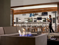 The space needed to be both scholastic in ambience and competitive with the countless hip bars and eateries being added to neighboring downtown Los Angeles. Black slate tables and lab benches create a large communal table designed for convivial interaction. The space is also dotted with murals of glass instruments and colored smoke, providing a backdrop for artfully laid out seating vignettes. Two large openings along the front make it easy to take advantage of the mild California weather.