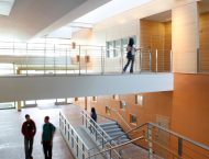 The campus master plan anticipated a significant entry for the building on axis with the existing lower quad. The building entry is on this axis and was developed as a visible beacon, both during daylight hours and at night. This main entry leads to a two-story, day lit, atrium space. Within the atrium is a resin “curtain,” rising two stories within the space. The curtain adds a tremendous amount of interest to the space, as well as aiding noise control from the atrium into the library. The curtain also helps to define the periodical reading space located directly behind it to the south.