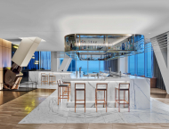 The lobby bar located on the east side of the lobby positions hotel guests and Angelenos alike to take in a privileged view of downtown LA. Looking over the skyscrapers, financial district and historic core, this "never-before-seen” perspective is the backdrop for the upscale bar formed out of bookmatched Italian marble, darkened nickel silver liquor display and custom-designed bar lamps.