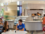 AC Martin’s design offers seating areas with different characters and styles—from more communal seating for groups and informal gatherings to individual bar seating for quiet types. We also provide an outdoor shaded dining area/lounge to be open 24 hours. Our design differentiates the dining areas with special characteristics by varying lighting, finishes, colors and ambiance. The idea is to create a “home away from home” for students and provide them with opportunities for gathering, meeting, and collaborating during meal hours and finding a space of their own—a place they feel represents them.