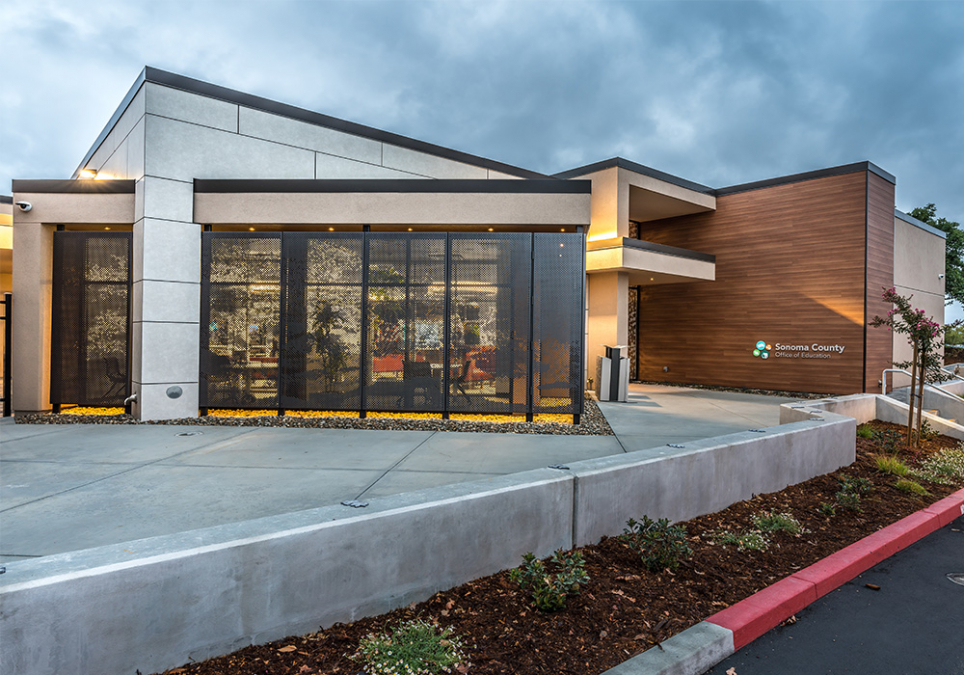 The project is a 7,500 sf free standing addition to the existing Sonoma County Office of Education (SCOE) named the Student/Teacher Learning Annex; a new facility for the North Coast School of Education, teacher credentialing program as well as other SCOE educational programs. The building includes four 960 sf classroom spaces separated by movable walls that can be combined in a number of configurations, depending on the need. There is also a 1,400 sf Networking Commons, where students and teachers can meet individually or in groups. This collaboration space is equipped with power, WiFi, and HDTV. The lounge includes a kitchen with enough space for having coffee, on-the-go meals, or even accommodate larger catered events. Two hoteling office spaces allow for private meetings or conferencing. Glass partitions with pivot doors separate the classrooms from the Networking Commons allowing the spaces to be opened for larger events and an overhead garage door that opens the space up into the outdoor patio.